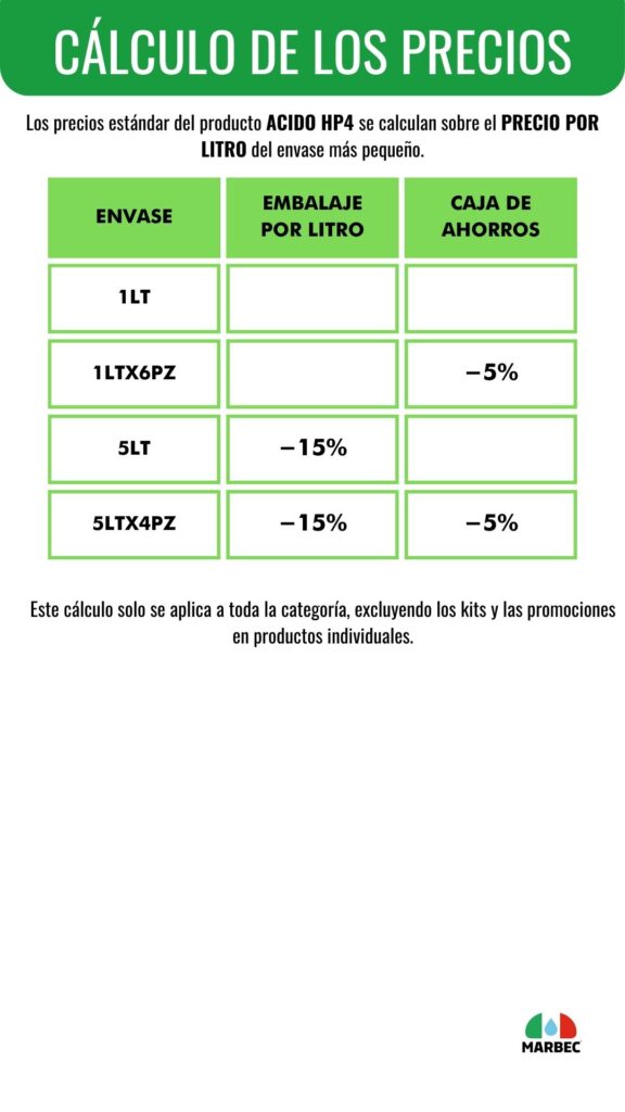 - Diluido 1 parte de ACIDO HP4 en 1 parte de agua: para el lavado donde es necesaria una acción de descalcificación normal.