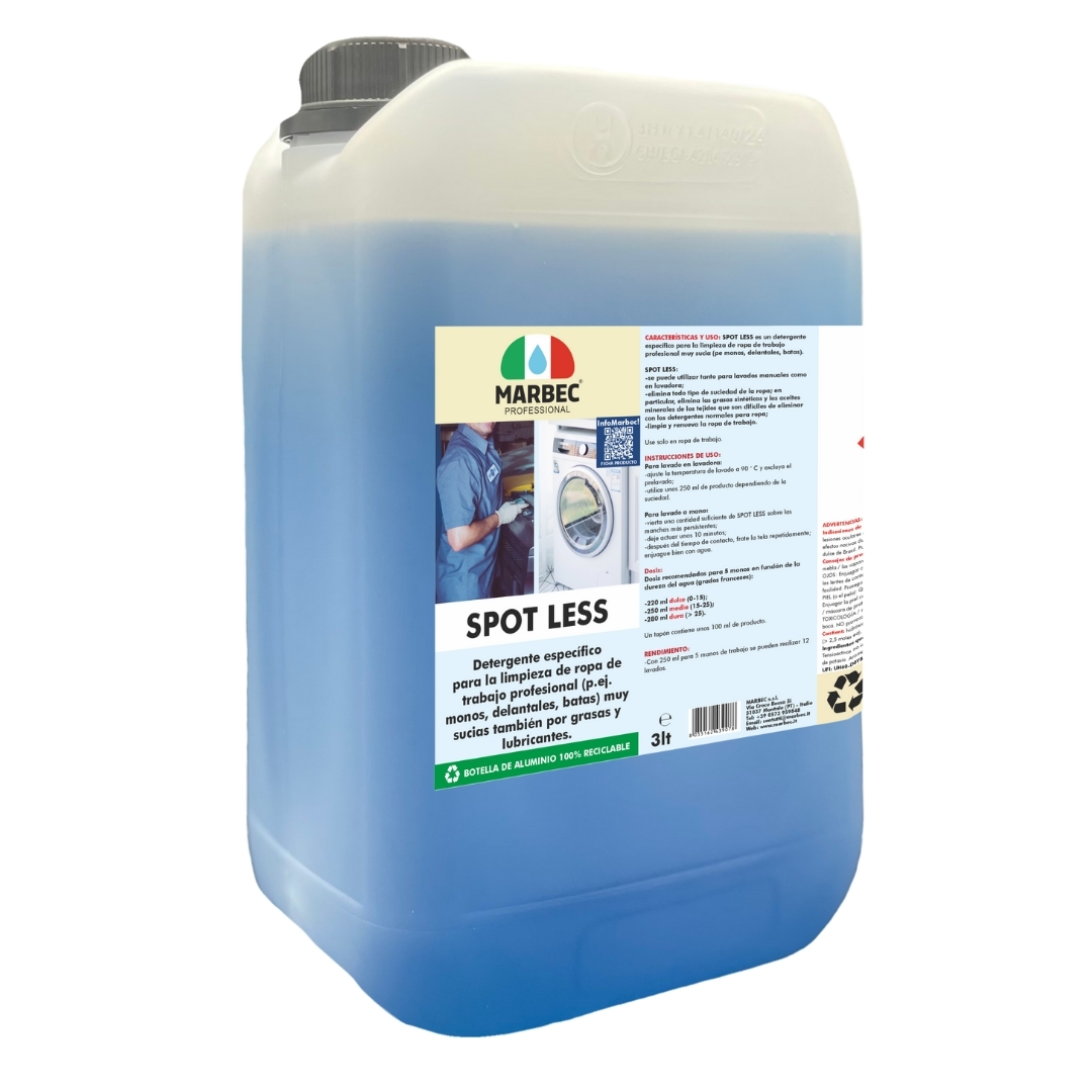 SPOT LESS es un detergente especialmente diseñado para ropa de trabajo profesional. Sus principales características incluyen una potente acción de limpieza capaz de eliminar incluso las manchas y los malos olores más persistentes y una fórmula delicada que preserva la calidad de los tejidos. Gracias a su eficacia y delicadeza, SPOT LESS es el compañero ideal para mantener en perfectas condiciones las prendas utilizadas en el contexto laboral, garantizando resultados impecables en cada lavado.